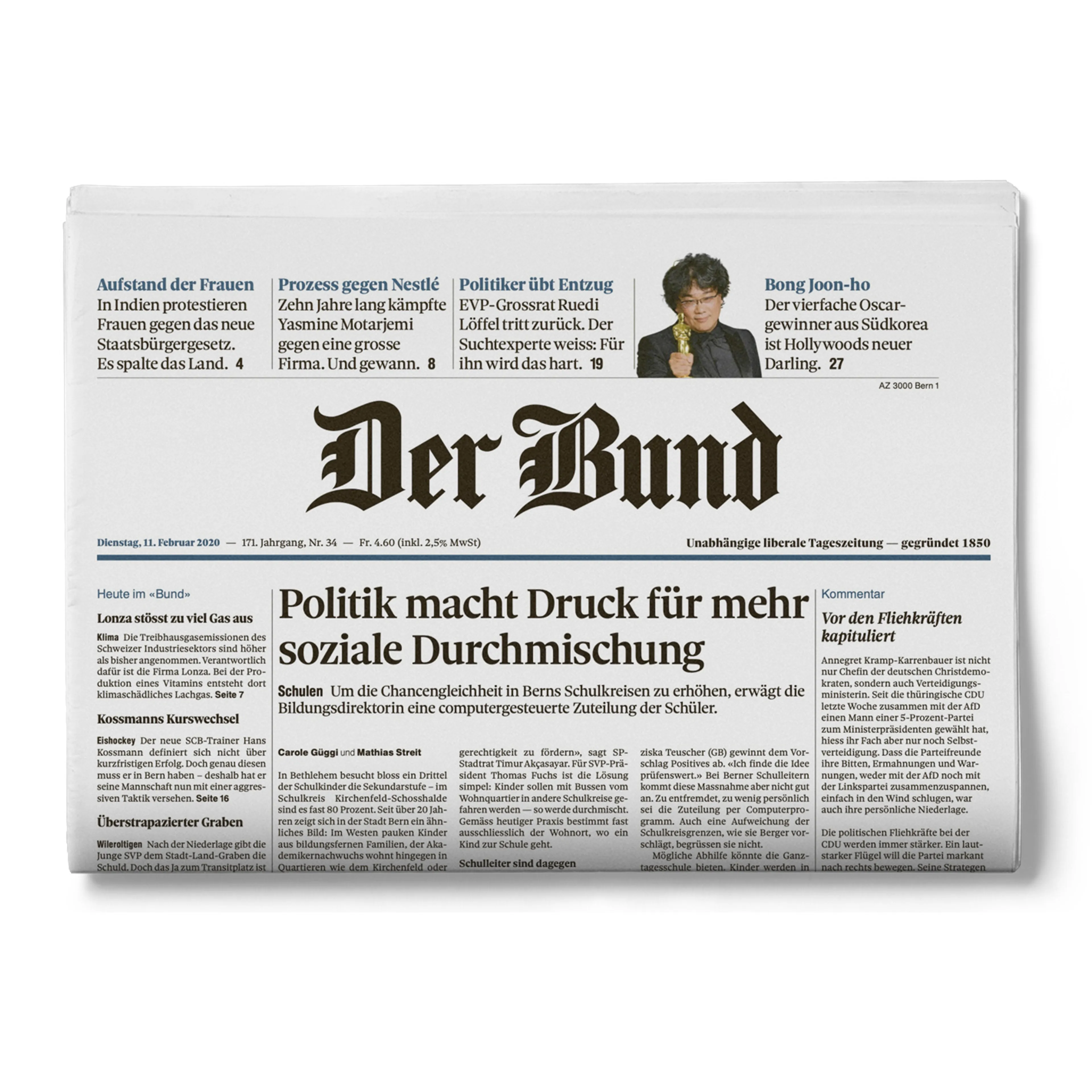 Der Bund richtet den Blick auf die Welt – mit Bern im Zentrum. Unser Team liefert fundierte Recherchen, fesselnde Reportagen und tiefgehende Analysen zu politischen und kulturellen Ereignissen in der Stadt und im Kanton Bern – ebenso wie in der Schweiz und im Ausland. Der Bund informiert, orientiert und unterhält intelligent. Der «Bund» steht seit 1850 in liberaler Tradition.
