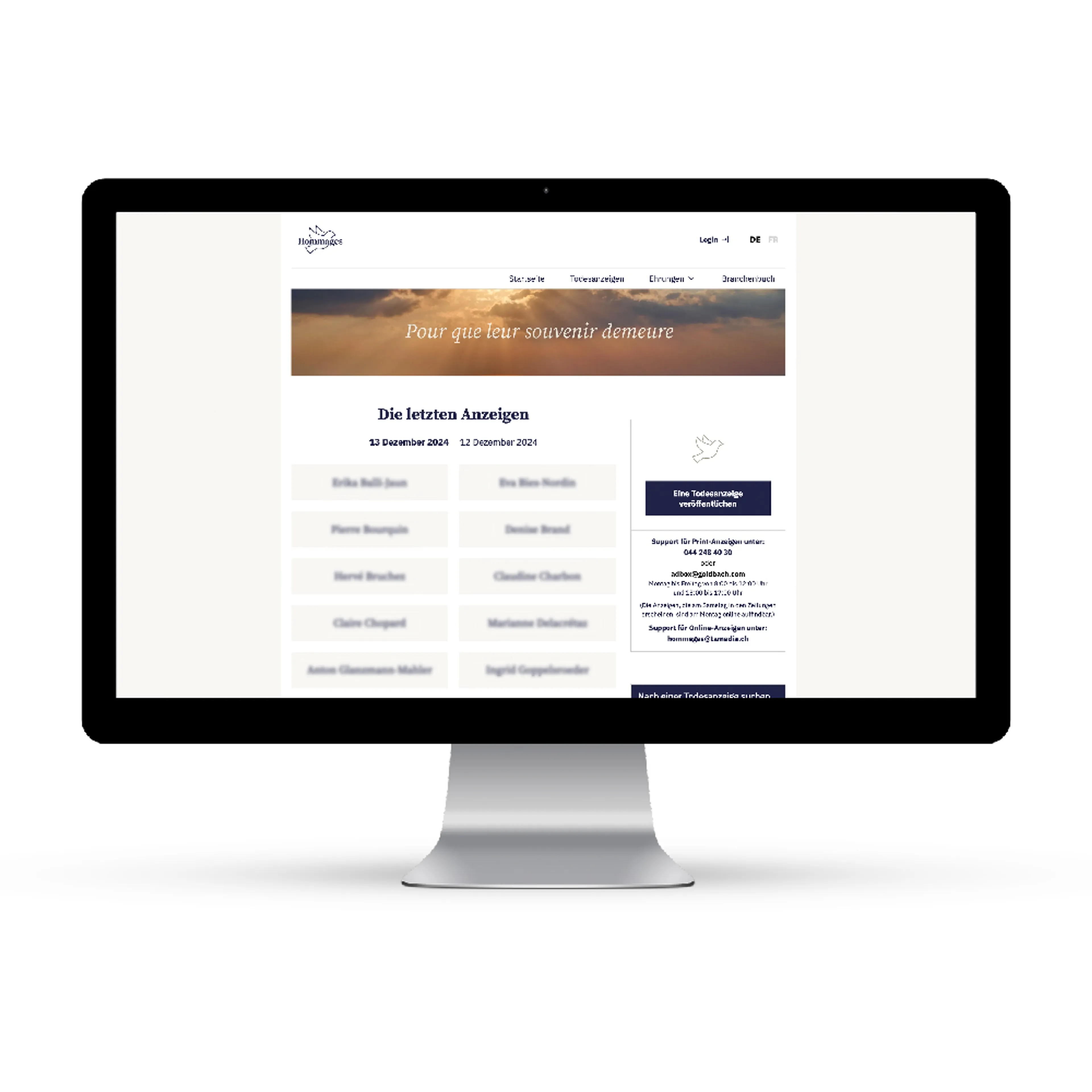 La plateforme hommages.ch offre aux personnes qui ont perdu un être cher la possibilité de publier un avis de décès. Elle recense également tous les avis de décès parus dans les journaux de Tamedia. Grâce à son offre de conseils, d’informations pratiques et de services, hommages.ch accompagne les proches de défunts, afin qu’ils puissent commémorer les personnes disparues.